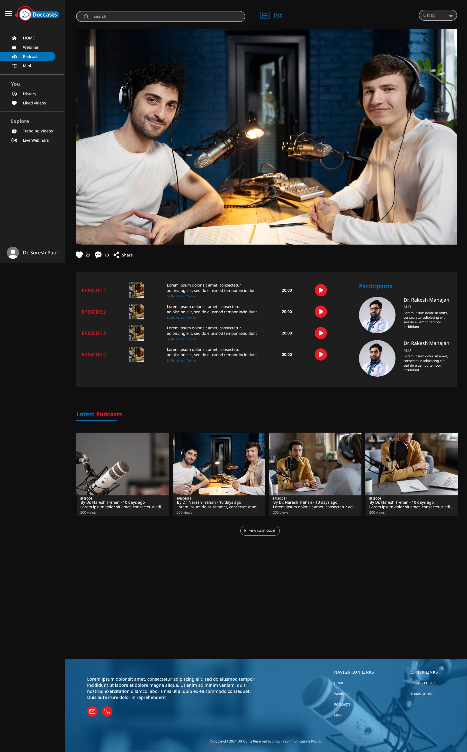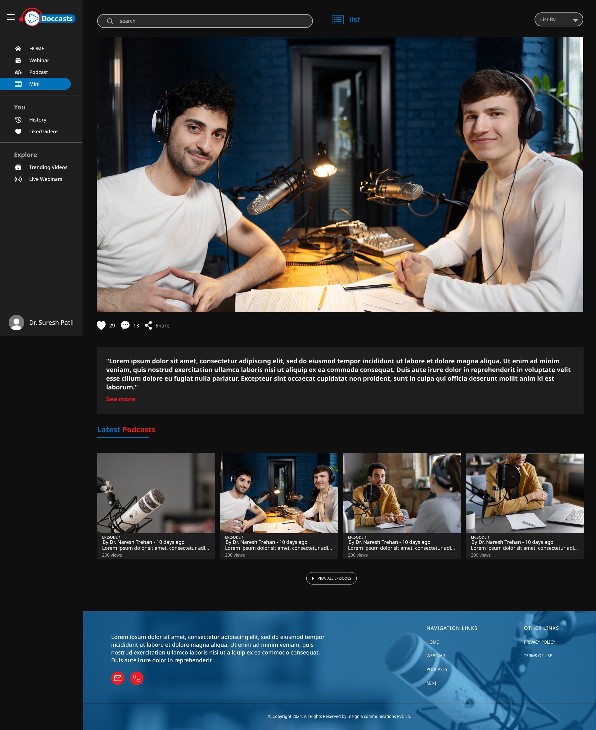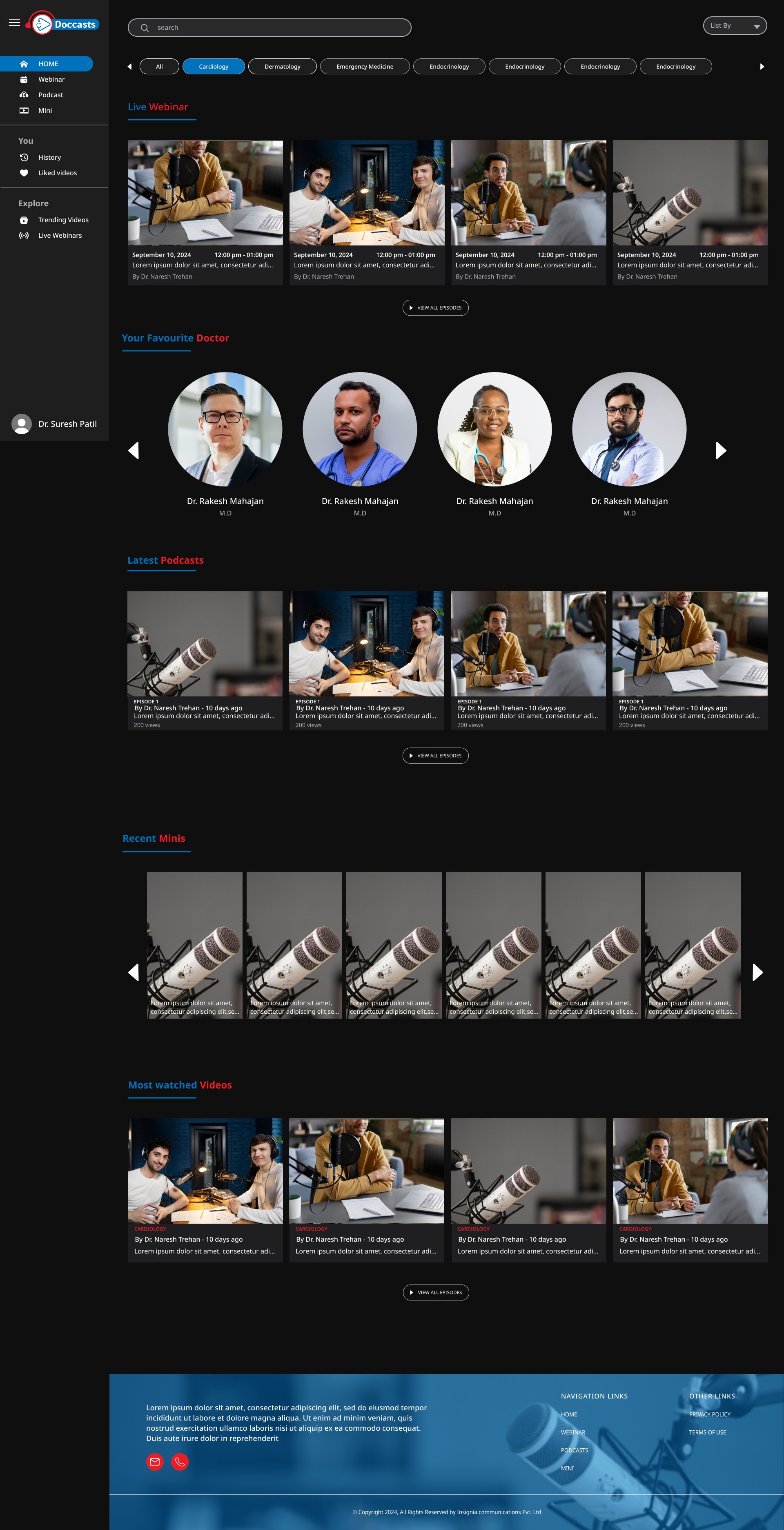 The primary goal of this project is to design an intuitive content discovery system that categorizes medical information by specialty, duration, and format (e.g., Mini Shots vs. Series). A key objective is to increase user engagement by providing a "smart resume" feature that allows doctors to stop and start long-form webinars or podcasts across different devices without losing their place. Ultimately, the platform aims to modernize medical education by providing a high-fidelity, broadcast-quality experience that makes professional development as engaging as a mainstream media network.