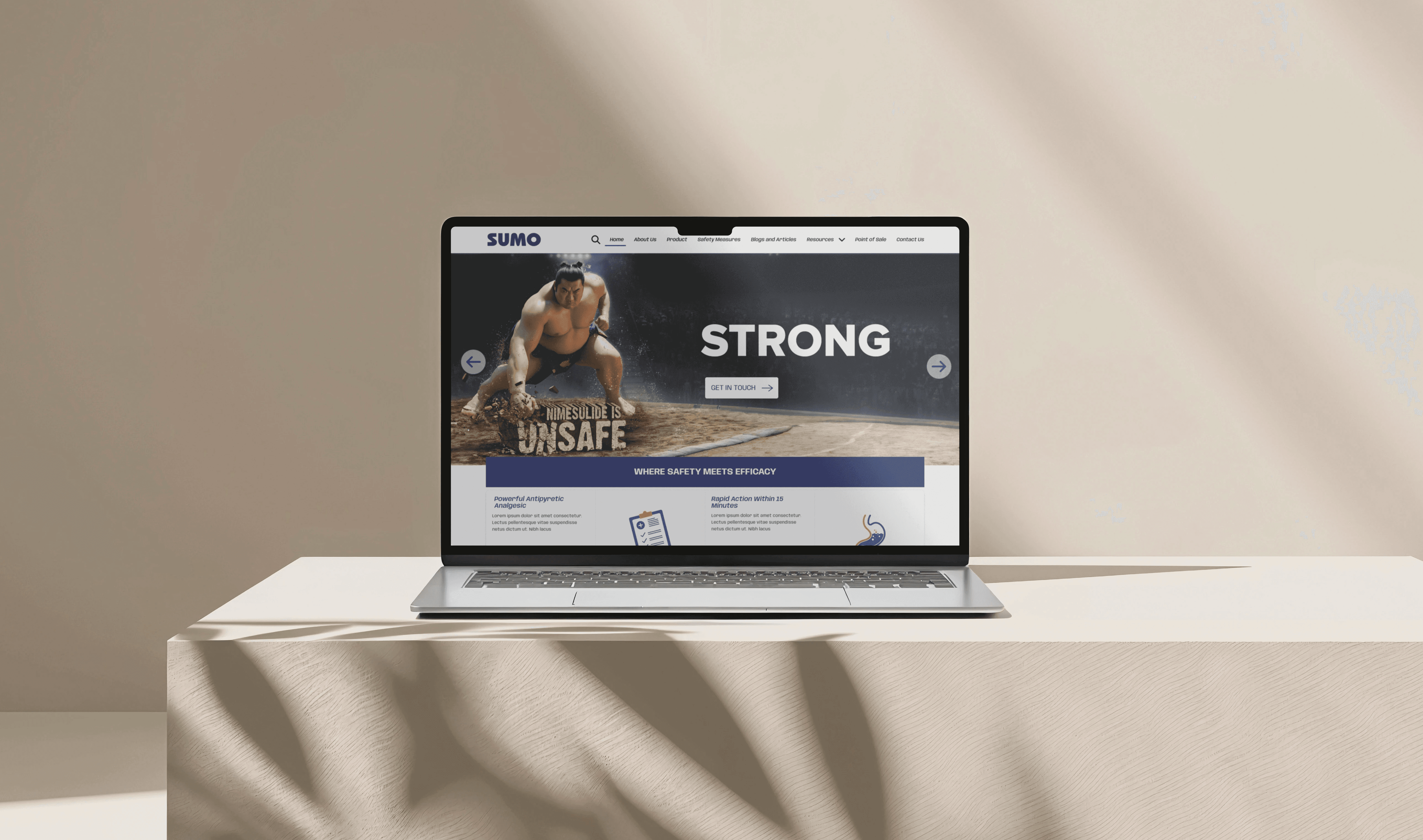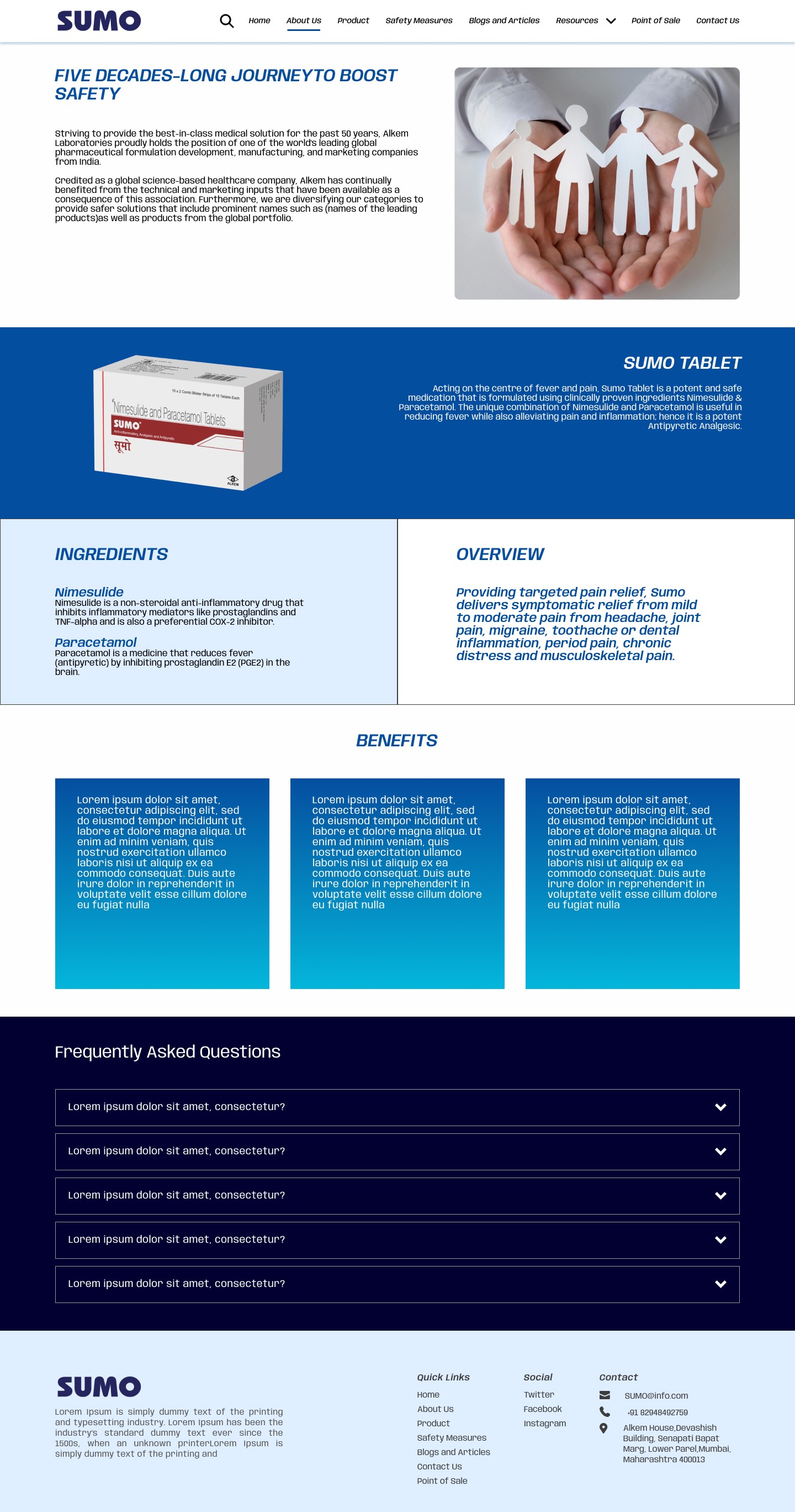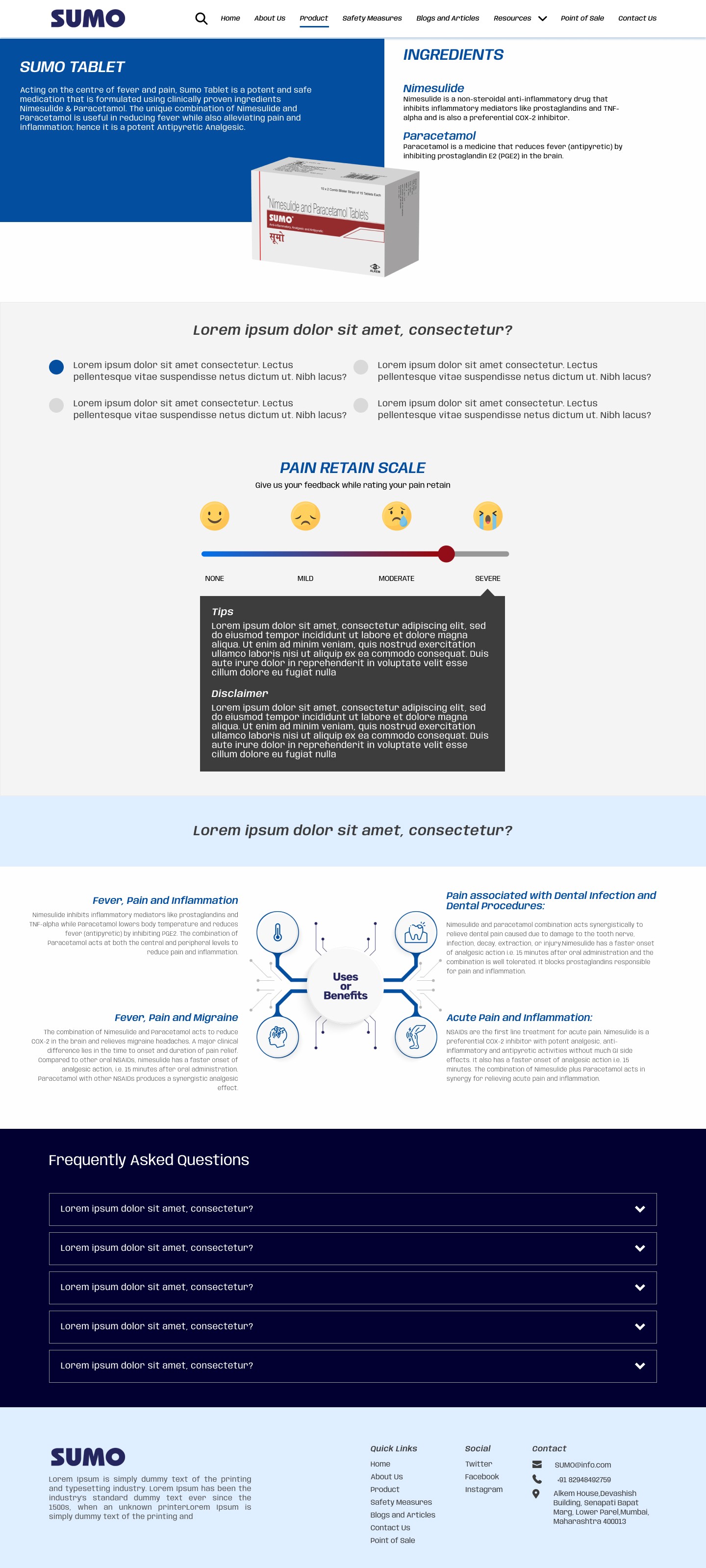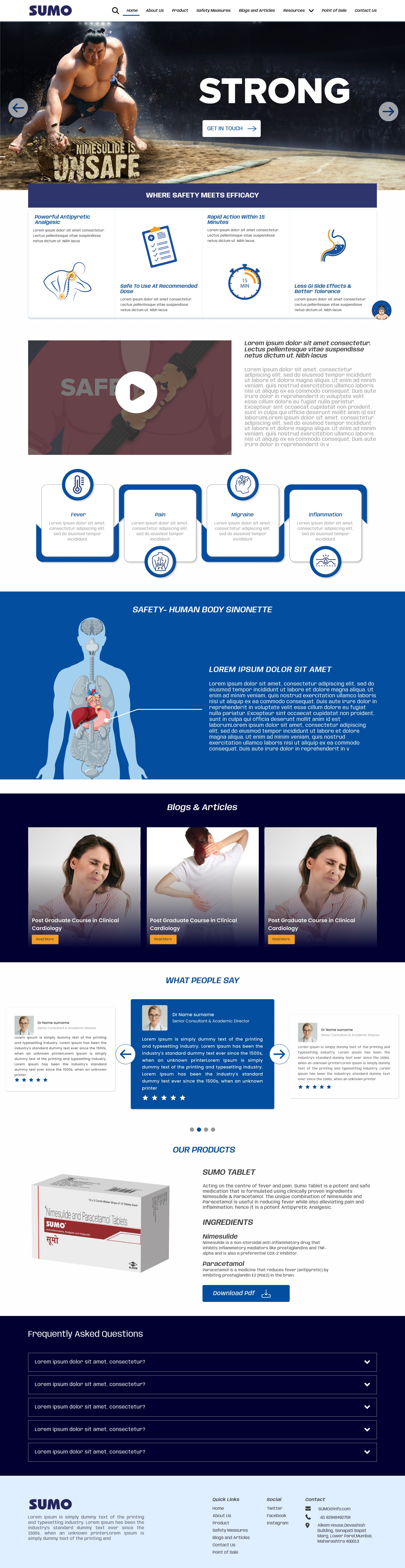 The SUMO project involved designing a responsive website for the launch of a new or repackaged combination analgesic medicine marketed by a major pharmaceutical company like Alkem Laboratories Ltd. The primary objective was to create a visually professional, authoritative, and trustworthy digital platform that could effectively communicate essential information to two distinct audiences: the general public (patients) and Healthcare Providers (HCPs). The main challenge was developing a clear Information Architecture (IA), utilizing "Clarity in Crisis" as the core concept, to ensure regulatory compliance and facilitate easy access to crucial data like transparent warnings and dosage instructions while maintaining a visually appealing and engaging user experience. The design prioritized trust signals, scannability, and a clear visual segregation of patient-focused education and HCP-focused clinical data.
